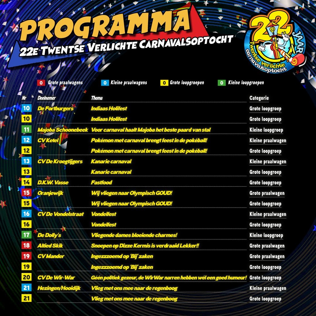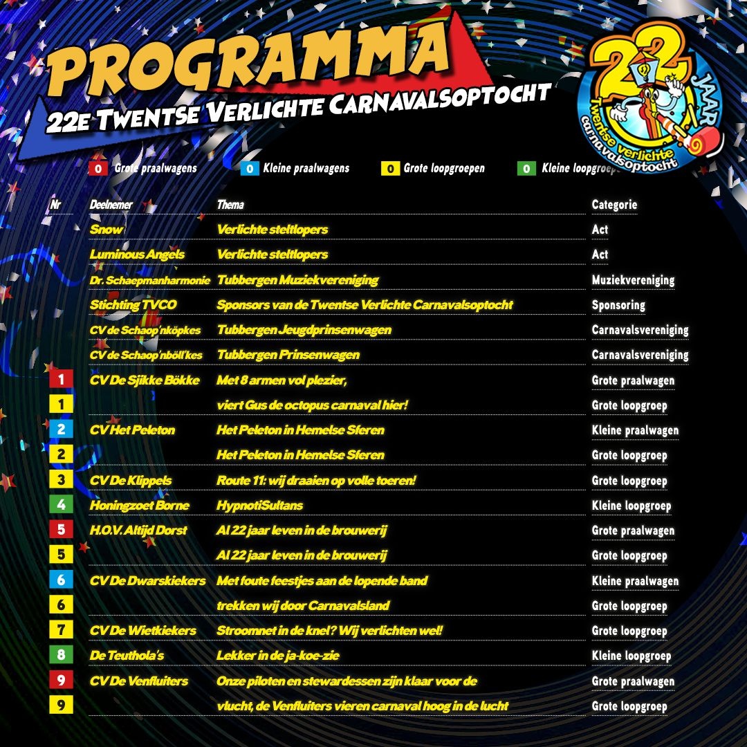 Benieuwd welke prachtige verlichte wagen en loopgroep je wanneer tegenkomt in de optocht? Bekijk dan hier de startopstelling.